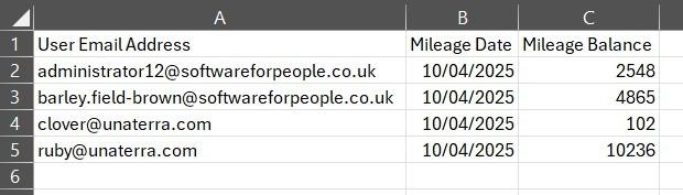 Complete the sheet with the users email address, date for the YTD mileage to be applied to and Mileage Balance. Save and return to Setup > People > Actions > Import to upload.