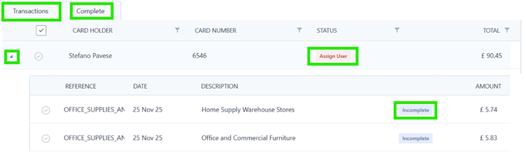 You can drop down the total row to see individual transaction and the status: incomplete (meaning the transaction is still in the card holders Expenses>Drafts) and submitted (meaning the transaction is in the approval process)